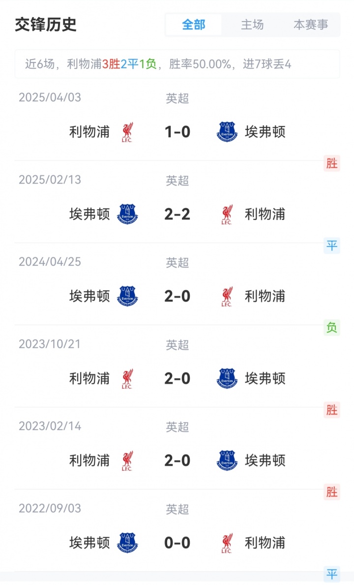 利物浦开局4场全胜积12分,排名英超第一;埃弗顿2胜1平1负积7分,排名英超第6。